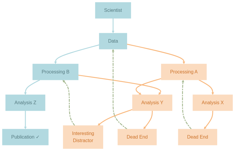So how do I navigate this mess? Ideally, I can (1) keep track of all my all tiny and big successes and failures, (2) do so without blowing up the project with unnecessary redundancy, (3) reuse or combine elements of (pre-)processing and analysis in different ways, (4) and (re-)visit and abandon or recover any state at any given time. In short, I want to experiment freely and safely in the space that is spanned by the data and the available (meaningful) manipulations without compromising reproducibility or creating unnecessary overheads.